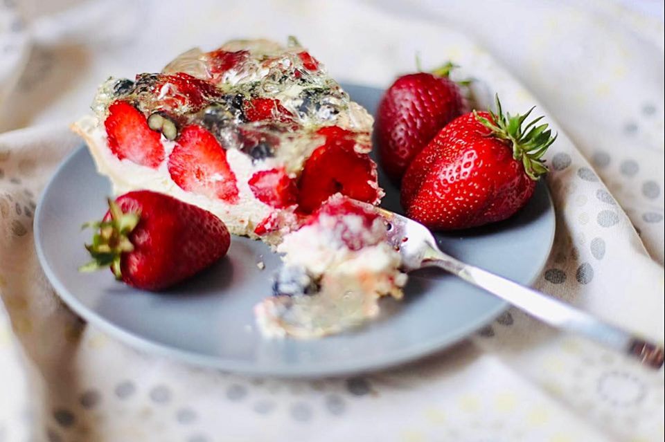 • truskawki myjemy, osuszamy, obieramy z szypułek. Układamy na kremie rozpoczynając od środka. W przestrzenie pomiędzy truskawkami rozsypujemy borówki.